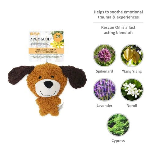 Aromadog rescue toys can help soothe emotional trauma and experiences. Made with lavender blend of 100% therapeutic grade essential oils to help calm your dog. Releases aroma with each play and squeak. Rescue toys helps with emotional trauma and experiences that are difficult to work through. Fearfulness, betrayal, rage, abandonment, grief and depression are emotions that must be overcome for a healthy live. Rescue toys helps the dog transition through mentally challenging times to becoming balanced and optimistic.Oil mixture of cypress, ylang ylang, lavender, spikenard and neroli. Exclusive brand to Rosewood. Big Head Stuffingless toy size 20x8x19cm approx.